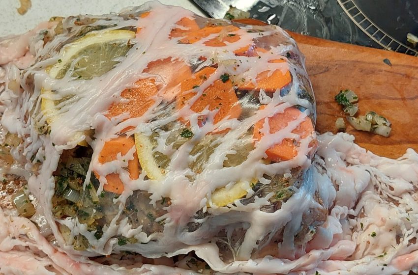 - Zavijemo v svinjsko mrežico, da med peko ostane lepo sočno.